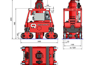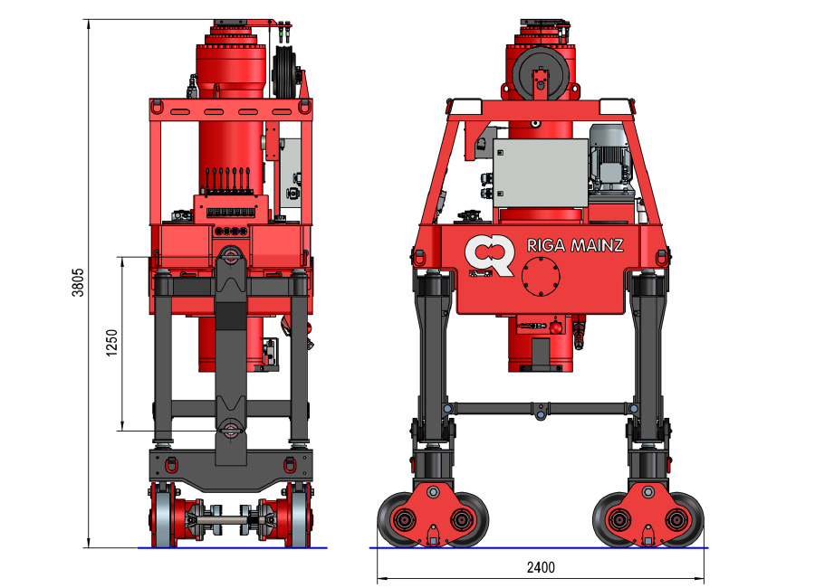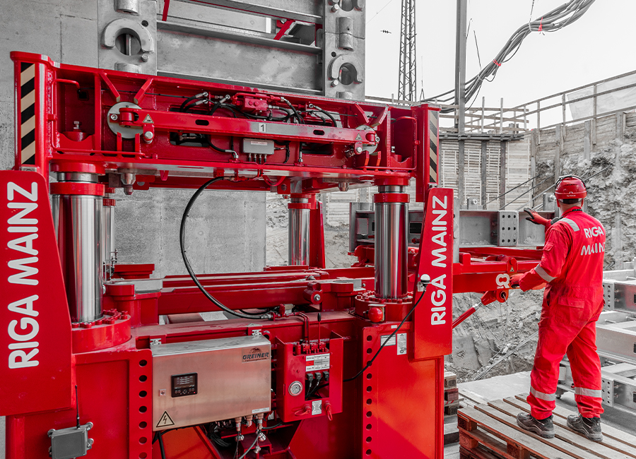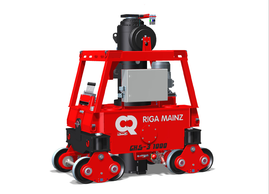 The new GHS 3-1000 lifting mast is available for moving heavy loads of up to 1,000 tons. The system consists of four three-stage extendable cylinder towers and is mounted on double travel rails with a width of 1,200 mm. A special feature of the modular system is an additional height increase that can be installed in the base frame (1,250 mm), which provides a total height of up to 10,100 mm (without gantry girders). For smooth parallel travel, the system‘s base frames are equipped with a track guide and are mechanically